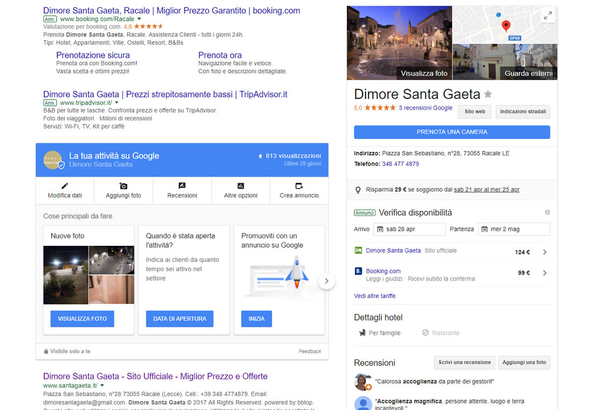 Se si cerca direttamente il nome della struttura su Google, la scheda apparirà sul lato a destra nei risultati di ricerca organici, con tutte le informazioni nel dettaglio.